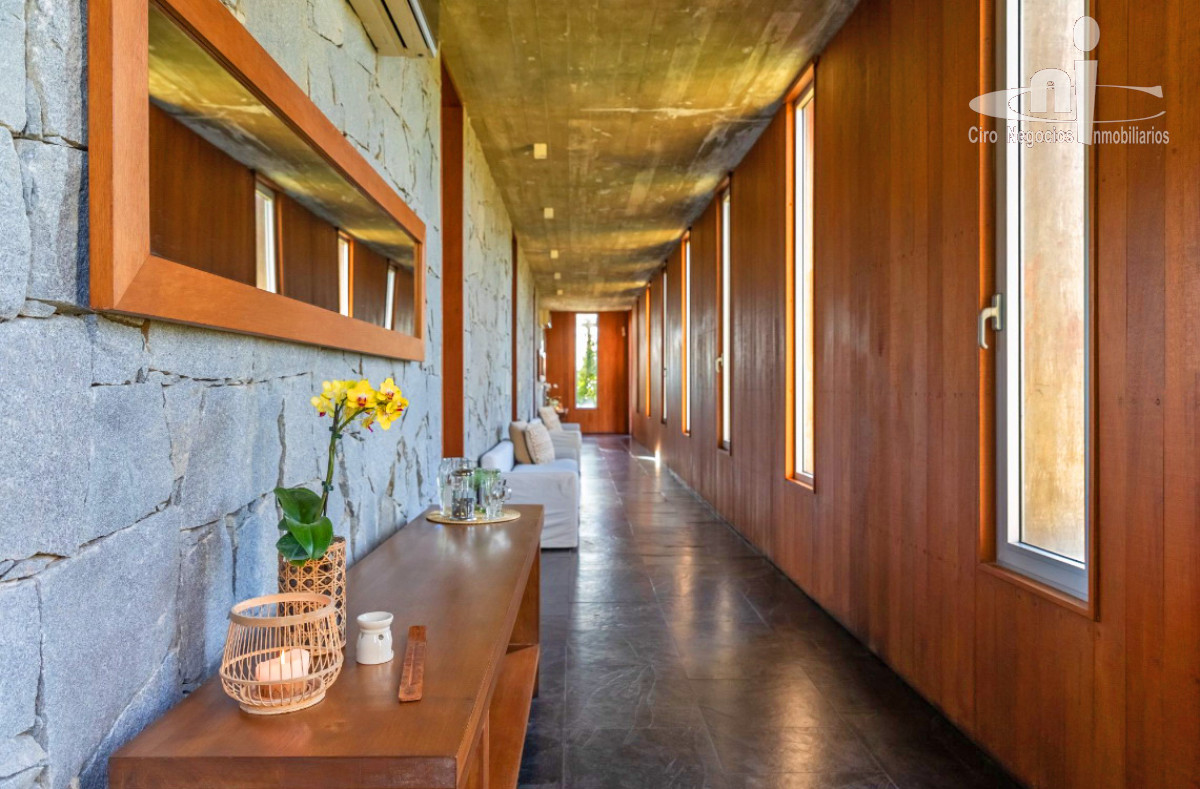 La casa cuenta con 5 amplios dormitorios con baño en suite, baño de visitas, sala de estar y comedor con capacidad para 10 y 12 personas, parrillero exterior techado, calefacción por suelo radiante para inviernos acogedores, aire acondicionado en todos los ambientes, piscina climatizada, amplios sofás y tumbonas, y sistema de audio central.