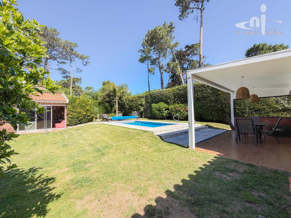 Pinares a 800 metros de la rambla . Living-comedor con estufa de alto rendimiento y salida a galería hacia el jardín, cocina definida, 4 dormitorios (1 suite), 2 baños completo. Pisos de lapacho. Al fondo, barbacoa cerrada con toilette, deposito y dependencia utilizada como lavadero con zona de tender. Piscina climatizada y salinizada de 6x3 metros. Lugar para 3 autos (uno cubierto). Vidrios con laminas de seguridad. Aire acondicionado en living-comedor y 2 de los dormitorios. Zona con saneamiento y fibra óptica.